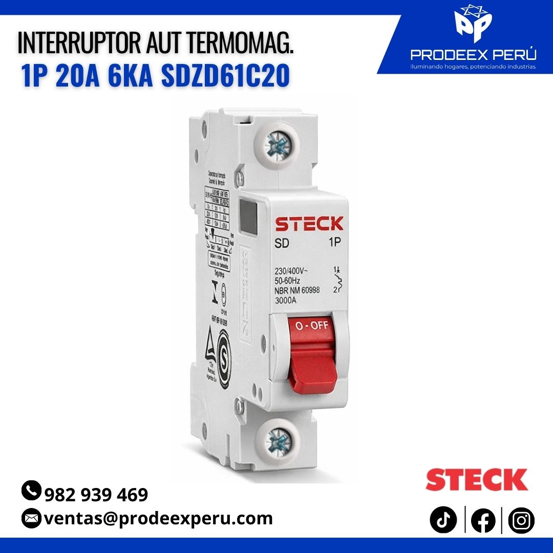Interruptor Steck 1P 20A 230V Curva C 6kA (SDZD61C20). Protección contra fugas de corriente y descargas eléctricas. Ideal para instalaciones eléctricas seguras y cumplimiento normativo.