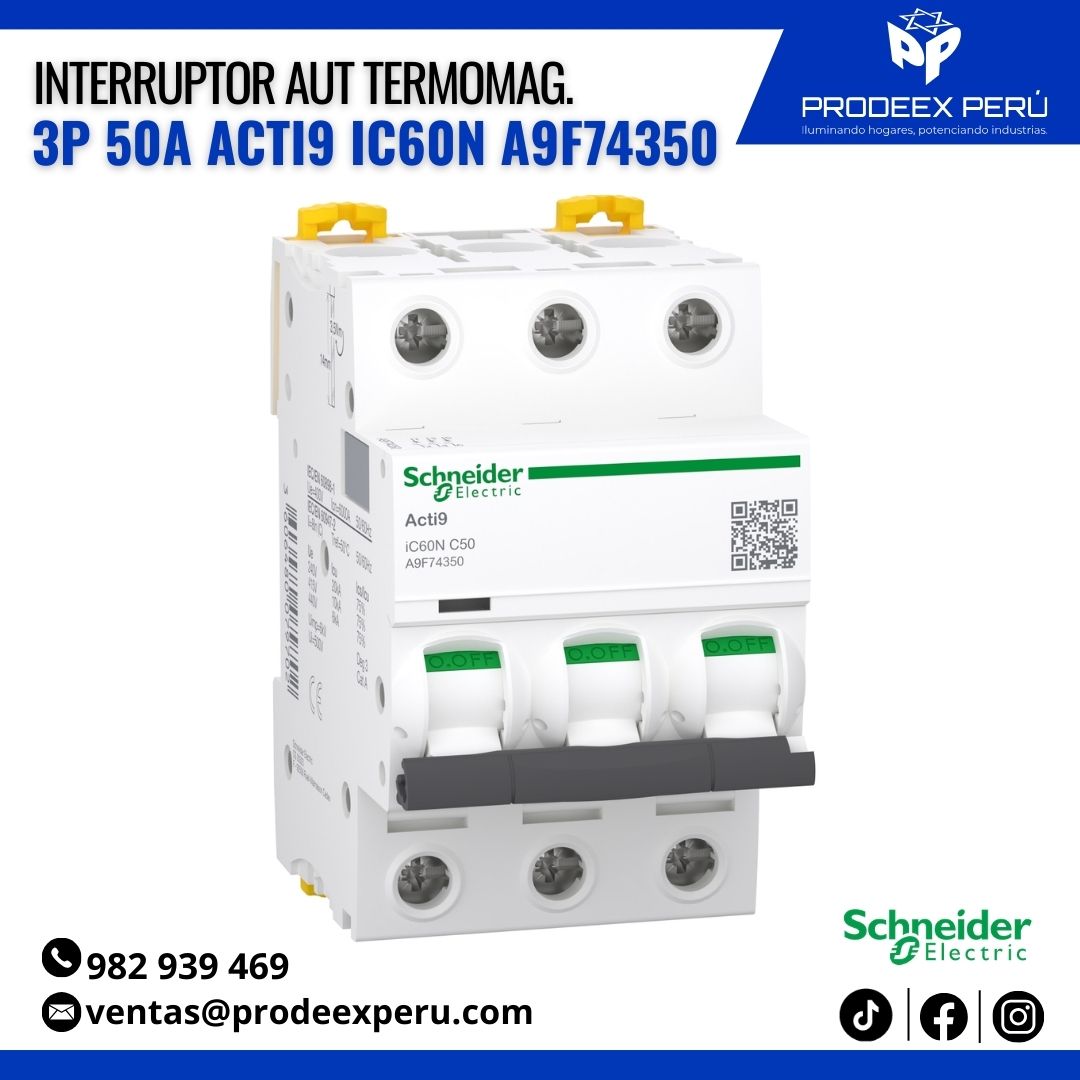Este interruptor automático cuenta con 3 polos, capacidad nominal de 50 amperios y curva de disparo tipo C, ideal para circuitos con cargas inductivas moderadas como motores, sistemas de iluminación y equipos eléctricos. Ofrece un poder de corte de 6kA a 400V CA (IEC 60898-1) y hasta 20kA a 220-240V CA (IEC 60947-2), garantizando alta seguridad y desempeño.